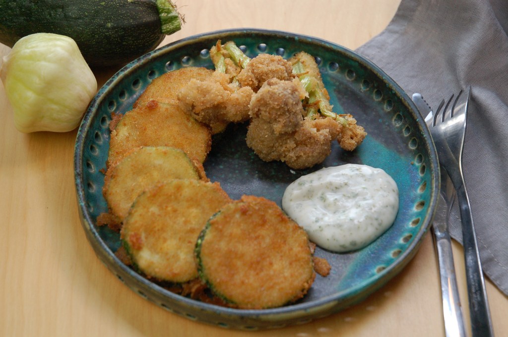 Eines meiner Lieblingsrezepte für den Herbst: knusprig frittiertes Gemüse mit einem cremigen Kräuterjoghurt-Dip. Ich verwende Hokkaido-Kürbis, der nicht geschält werden muss, dazu Romanesco, Zucchini und Zwiebelringe. Alles wird in einer knusprigen Panade frittiert und mit einem frischen Dip serviert. Im Sommer nehme ich dafür auch gern junge Patisson-Kürbisse aus meinem Garten – die schmecken genauso gut. Für den Kräuterdip nehme ich Verjus, das gibt dem Dip eine leichte Säure und ist eine tolle Alternative zu Zitronensaft. Kürbiskernöl verleiht Farbe und eine nussige Note. Früher habe ich eine dicke Hafermehl-Wassermischung als Eiersatz verwendet. Vor kurzem bin ich aber drauf gekommen, dass Hafersahne statt Ei sehr gut funktioniert– das macht die Panier nicht nur vegan und histaminarm, es geht sehr leicht und gibt eine schöne Knusprigkeit.