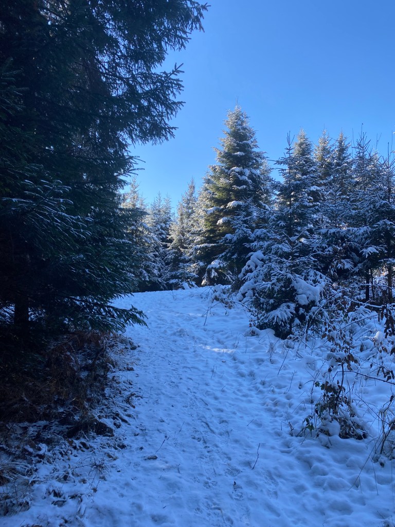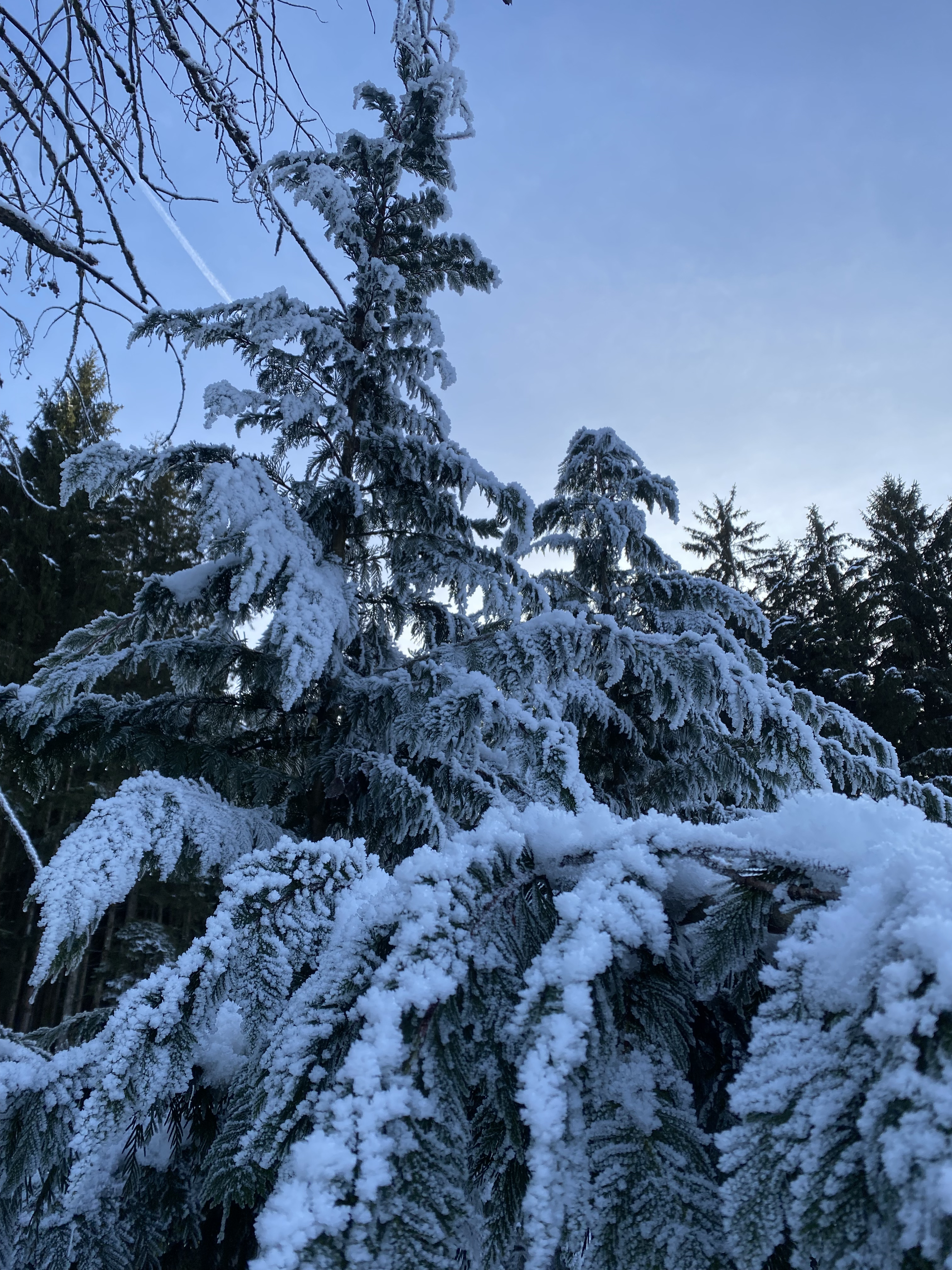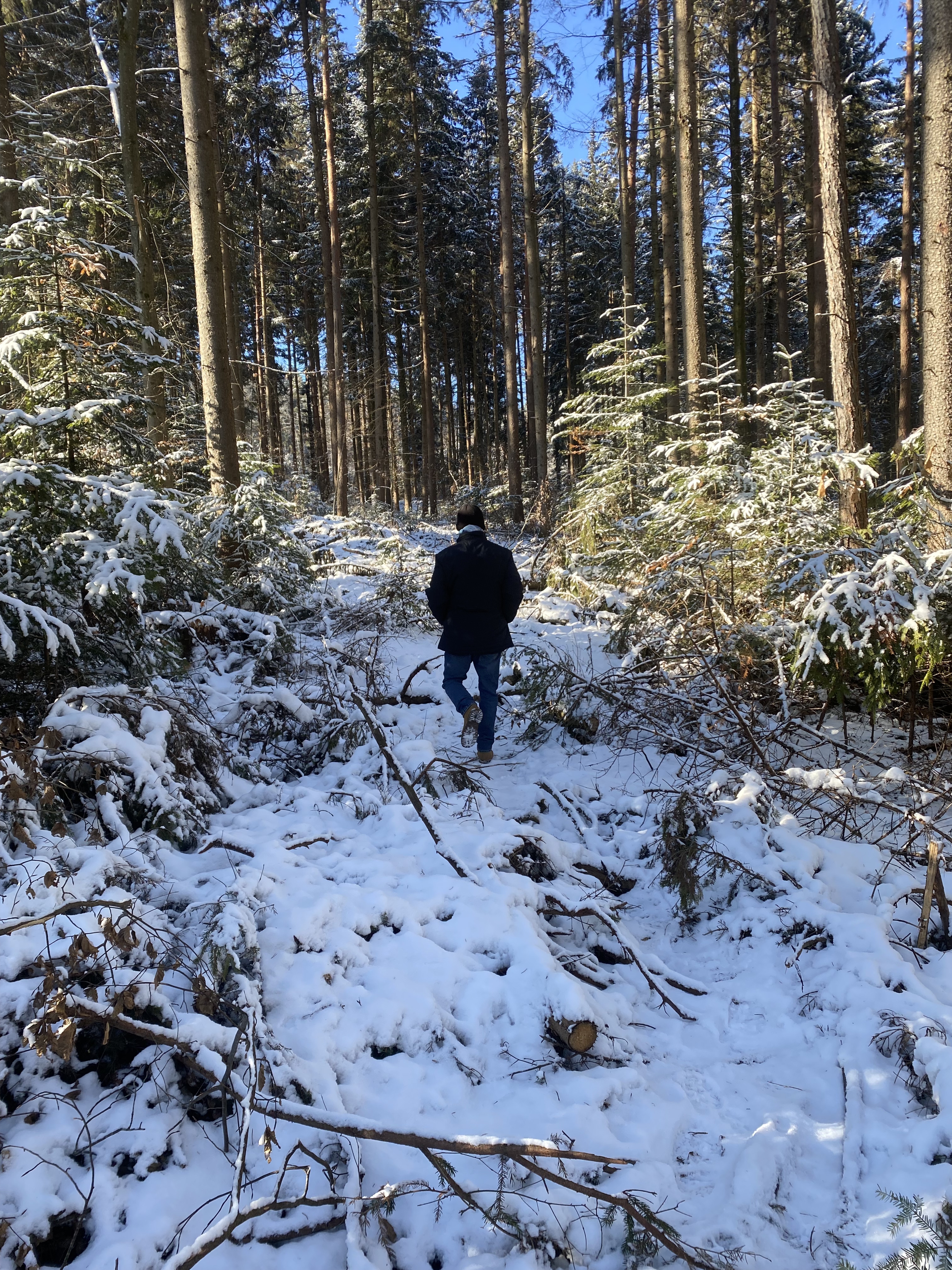Psychologisch gesehen ist so ein Spaziergang auch ein bisschen ein Energiebooster. Anfangs widerstrebt es mir, aber während ich gehe, nimmt mein Gehirn die Umgebung bewusster wahr. Ich konzentriere mich auf den Rhythmus oder auch nur auf das Setzen meiner Schritte. Denn im Schnee hinter meinem Mann herstapfen ist zwar nicht schwierig, doch der verschneite Weg ist sehr uneben, die Wurzeln verdeckt.