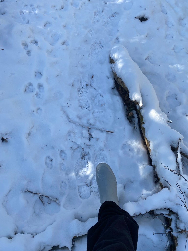Und dann sind die Gedanken freundlicher, die Stimmung besser, der kleine innere Widerstand schmilzt dahin. Jetzt im Schnee Spuren zu sehen, macht mir Freude. Ich sehe die Spuren von Schuhen und daneben Hundepfoten, aber auch Hufe von Rehen, Pfoten von Hasen und vermutlich die eines Fuchses. Ich stelle mir vor wer da vor mir den Schnee berührt hat, gegangen, gehoppelt und gerannt ist.
