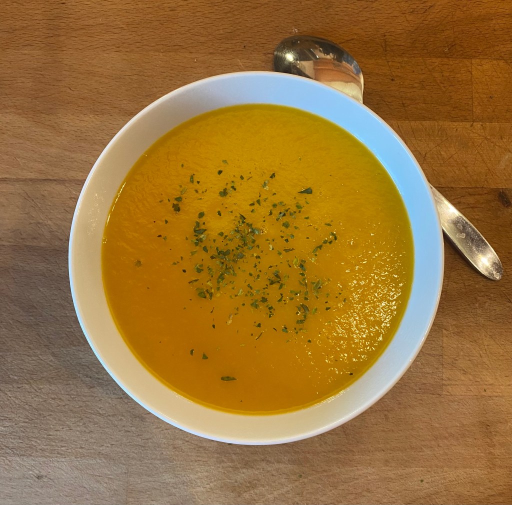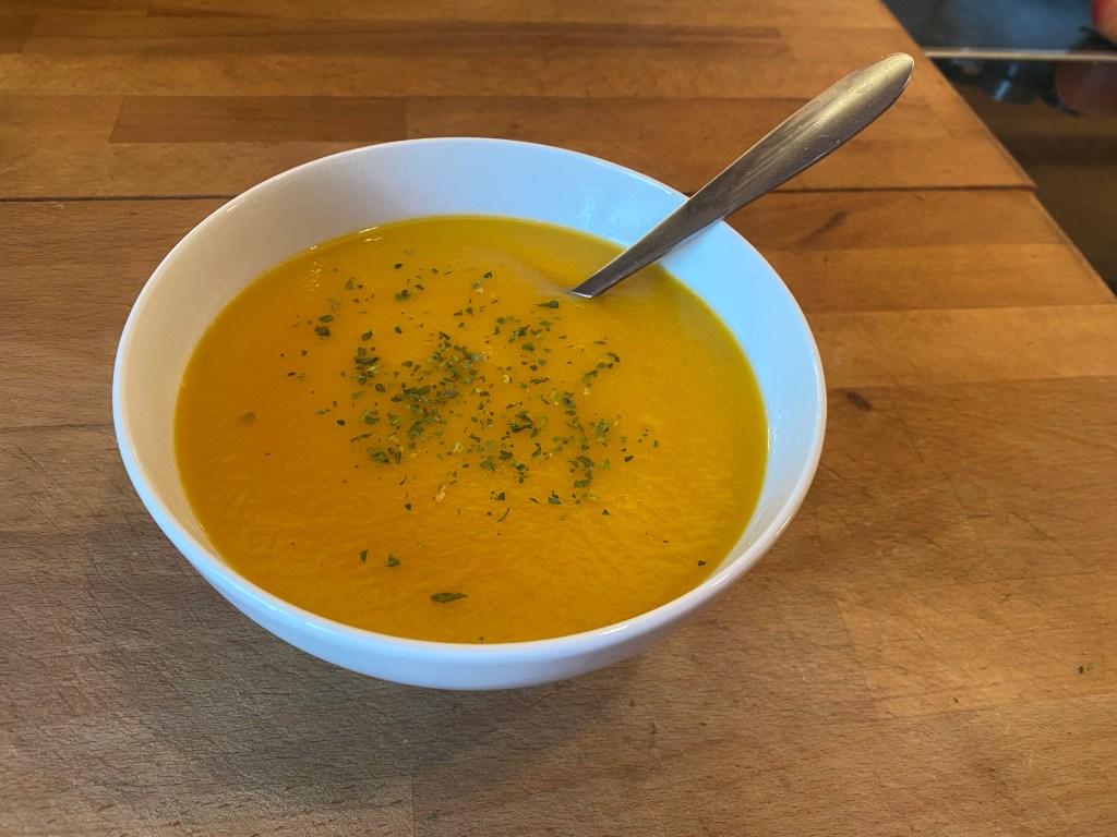 Ich wollte eine einfache, histaminarme, vegane Karottensuppe machen. Zutaten rein: Karotten, Zwiebel, Wasser, ein Gemüsesuppenwürfel und ein bisschen getrocknete Petersilie. Das Gerät hat ein Programm namens „Sojamilch“ – das ist gleichzeitig auch das Programm für das Kochen. Ungefähr 20 Minuten später hatte ich eine Suppe, die mir wirklich gut geschmeckt hat. Cremig und seidenweich. Und vor allem: kein Anbrennen, kein Umrühren, kein Stress.